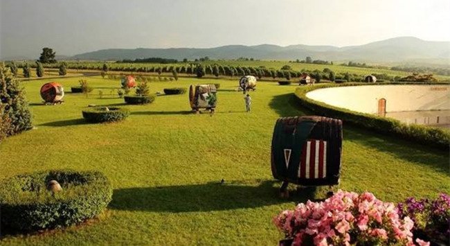 格魯吉亞葡萄酒釀造工藝獨具特色,雖然也運用歐洲釀酒方式,但很多酒莊仍沿用著最為傳統的“克韋夫利”(kvevri)釀酒法。這種圓錐型的特制陶罐,容量可達3000-5000升,裝滿葡萄汁后埋入圖中,只將罐口露出地面,埋入土中的罐子就可使葡萄汁在適宜溫度下發酵,并且使葡萄酒在良好狀態下保存相當長時間。