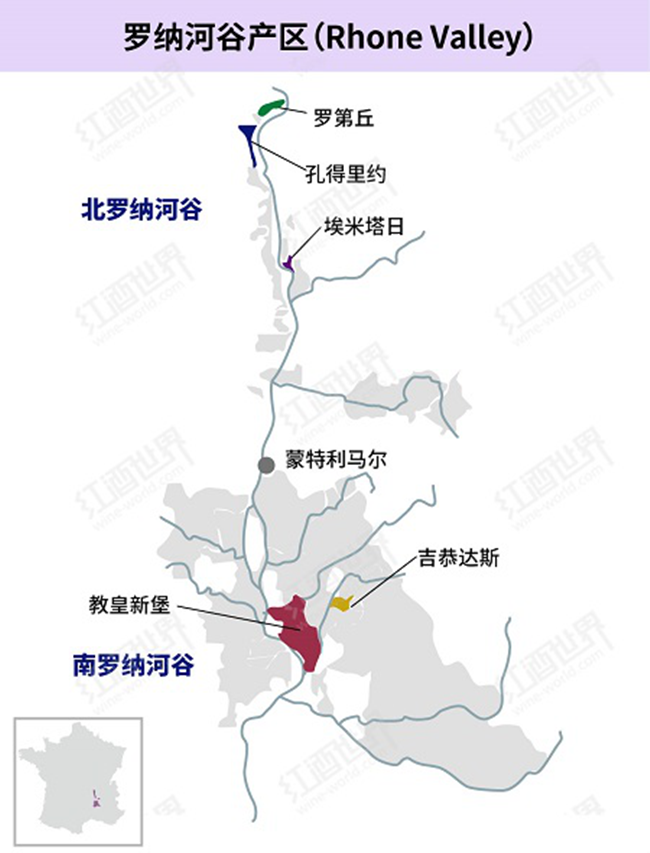 羅納河谷位于法國南部,整體沿著羅納河(Rhone River)由北向南呈條狀分布。這里歷史悠久,一直是法國備受追捧的葡萄酒產區。因南北區域的自然環境差異較大,羅納河谷產區一般被分成兩個部分,其中瓦朗斯鎮(Valence)以北為北羅納河谷(North Rhone),蒙特利馬爾鎮(Montelimar)以南為南羅納河谷(South Rhone)。北羅納屬于溫和的大陸性氣候,葡萄園多位于陡峭的山坡上,這里主要生產西拉(Syrah)紅葡萄酒,但也會釀造少量維歐尼(Viognier)、瑚珊(Roussanne)和瑪珊(Marsanne)白葡萄酒。南羅納則屬于地中海氣候,這里炎熱干燥且風力強勁,葡萄園的地形更為平坦。南羅納擁有比北羅納更加豐富的葡萄品種,包括西拉、歌海娜(Grenache)、慕合懷特(Mourvedre)和白歌海娜(Grenache Blanc)等。其中,最為重要的是歌海娜,其常與西拉、慕合懷特和神索(Cinsault)等品種一同混釀。