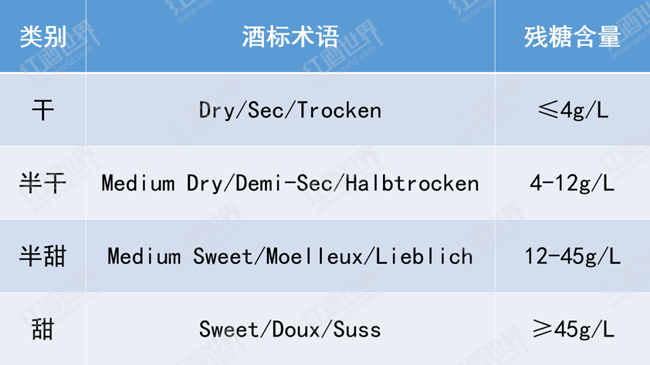 人們根據殘糖含量將葡萄酒分為了包括干型在內的幾個類別,具體可參照下表。需要注意的是,“干型”葡萄酒并不是完全不含糖,只是含糖量較低,無法被人所感知而已。