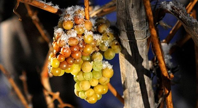 就如許多發(fā)明一樣,冰酒的誕生也是一次意外。據(jù)說在十八世紀(jì)末的德國,葡萄還沒來得及采收,就遭遇了嚴(yán)寒天氣,釀酒師們被迫用結(jié)冰的葡萄來釀造葡萄酒,結(jié)果卻意外得到了香氣純凈馥郁、口感甜蜜誘人的佳釀。采用結(jié)冰葡萄釀酒的方法便由此在德國逐漸流傳開來。