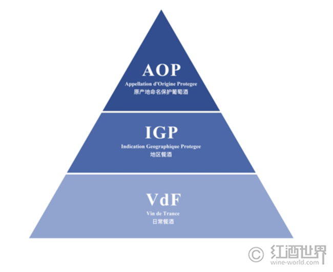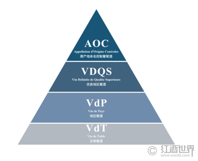 在該分級體系中,法國葡萄酒從高到低被劃分成原產地命名控制葡萄酒(AOC)、地區餐酒(Vin de Pays/VdP)和日常餐酒(Vin de Table/VdT)三個等級,而后又于1949年在AOC與VdP之間新增了優良地區餐酒(Vin Delimite de Qualite Superieure/VDQS)這一級別。