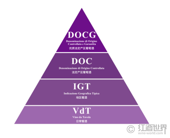 上世紀60年代之前,意大利尚沒有確立行之有效的葡萄酒分級制度,消費者難以在種類繁多的意大利葡萄酒中甄別出優質佳釀,這很大程度上阻礙了意大利葡萄酒在國際市場上的發展。于是從1963年開始,意大利便逐步建立并完善其葡萄酒分級體系,把葡萄酒劃分為4個品質級別。