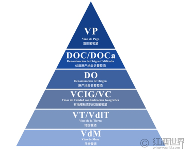 西班牙在20世紀30年代初期就擬定了原產地命名制度(Denominacion de Origen,簡稱DO),但直到70年代才正式頒布實施。傳統的西班牙葡萄酒分級體系和法國的等級劃分大有不同,不過自2003年改革后,其框架已越來越接近于法國的分級體系。西班牙的葡萄酒分級包含以下6個級別: