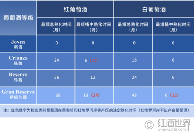 另外,西班牙葡萄酒的分級也有著自己的特色——規定了DO及以上級別葡萄酒的最短總熟化時間以及桶中熟化時間。根據熟化時長,西班牙葡萄酒分為新酒(Joven)、陳釀(Crianza)、珍藏(Reserva)和特級珍藏(Gran Reserva)這4個等級。