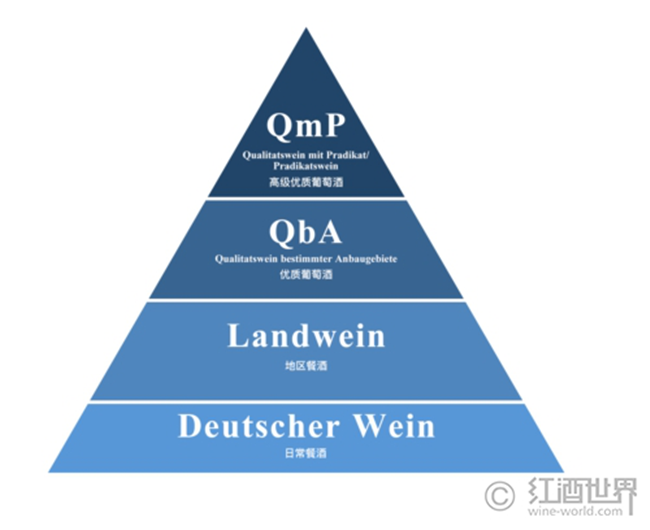 簡單來說,德國葡萄酒分為日常餐酒(Deutscher Wein)、地區餐酒(Landwein)、優質葡萄酒(Qualitatswein bestimmter Anbaugebiete/QbA)和高級優質葡萄酒(Pradikatswein)4個等級。