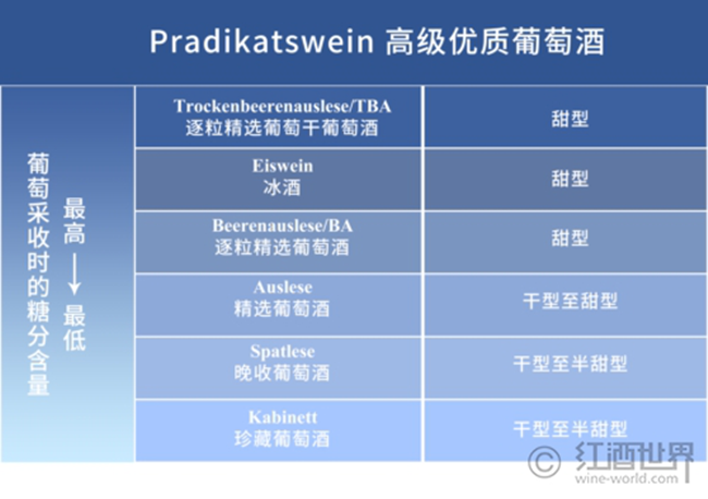 值得一提的是,由于德國所處緯度較高,氣候較為寒冷,葡萄成熟度對葡萄酒的品質影響重大,所以相關機構又根據葡萄采收時的成熟度,將高級優質葡萄酒細分為以下6個等級: