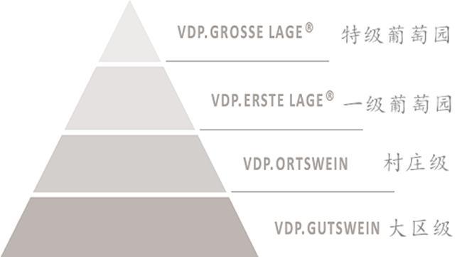 除此之外,由德國頂尖酒莊組成的德國名莊聯盟(Verband Deutscher Pradikatsweinguter,簡稱VDP)也推出了適用于成員酒莊的分級體系。與官方的分級制度不同,該體系依據葡萄園的質量和風土特點、葡萄種植技術及年份品質,將葡萄園分為4個等級。