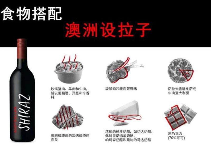 將澳大利亞設拉子與美食搭配的訣竅是選擇與葡萄酒的力量感和強壯程度相匹配的原料或菜肴。值得注意的是,澳大利亞設拉子胡椒般的辛香料味道與烤肉是奇跡般的絕佳搭配。