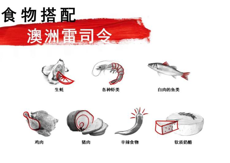 清爽,擁有檸檬-青檸風味的干型雷司令:魚,貝類和甲殼類等海產是理想的搭配,特別是佐以檸檬、刺山柑、奶油醬汁或者亞洲調味汁時。雞肉和豬肉類菜肴能很好的和中度酒體風格的雷司令搭配。