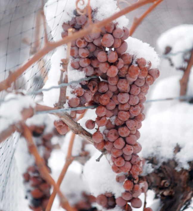 風(fēng)干葡萄將“濃縮就是精華”奉為真理,冰葡萄則用冰霜鎖住精華。在寒冷地區(qū),種植者們會(huì)將葡萄留于枝頭,成串結(jié)冰,直至嚴(yán)冬在夜間進(jìn)行采收。冰葡萄硬度大,壓榨時(shí)需要施加較大壓力,榨出來(lái)的葡萄原汁僅有正常收獲葡萄的五分之一,卻濃縮了很高的糖分、酸度和風(fēng)味物質(zhì)。最終的成酒沒有風(fēng)干葡萄酒那樣不加掩飾的奔放香氣與厚重酒體,而是以清潤(rùn)甜美的風(fēng)格自成一派。