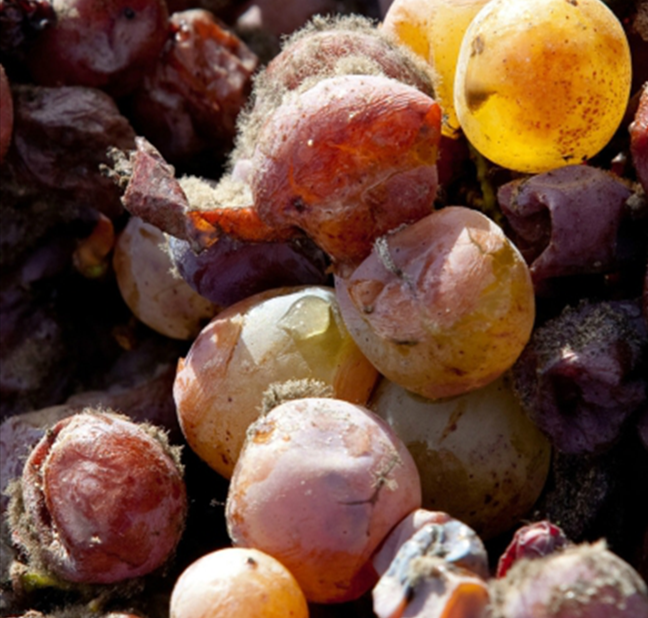 如圖所示,貴腐葡萄身形干癟,表皮還伴有細(xì)細(xì)的菌絲,若對(duì)該類葡萄沒有了解,定會(huì)認(rèn)為這是發(fā)了霉的爛葡萄,但到了葡萄農(nóng)這兒,它就是彌足珍貴的釀酒原料。要成為貴腐葡萄,被灰葡萄孢菌(Botrytis Cinerea)侵染是第一步,但灰葡萄孢菌“亦正亦邪”,在適當(dāng)條件下,它可以轉(zhuǎn)化為有益的貴腐菌(Noble Rot),反之則有可能化身為誘導(dǎo)果實(shí)腐爛變質(zhì)的灰腐菌(Grey Rot)。因此,健康果實(shí)感染灰葡萄孢菌的“造化”就全憑清晨是否潮濕多霧、午后是否晴朗干燥來(lái)決定了。成功被貴腐菌侵染的葡萄表皮穿孔、水分蒸發(fā),糖分、酸度以及風(fēng)味物質(zhì)高度濃縮,與風(fēng)干葡萄有著異曲同工之妙,卻比風(fēng)干葡萄產(chǎn)量更低、更加難能可貴。