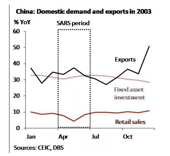 星展集團(DBS Group)的報告指出,2003年SARS疫情爆發期間零售銷售遭到很大的打擊,但疫情過后短時間內消費就有很大的反彈。可以預見,新冠疫情結束之后,經營良好的企業將趁著消費反彈的大勢蠶食原本屬于健康度不佳的企業的份額。
