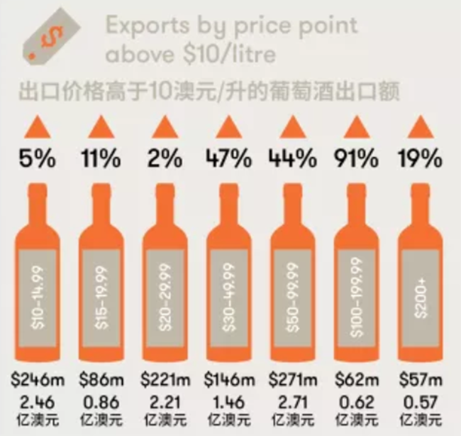 價格低于2.5 澳元/升(離岸價)的澳洲葡萄酒出口額下降最為明顯,降低了17%至4.63億澳元。