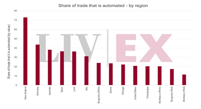 我們發現,在Liv-ex上非傳統強勢市場的酒區,它們會有更多葡萄酒通過自動化來進行交易。 如新西蘭:該酒區有超過70%的葡萄酒交易都涉及自動化。
