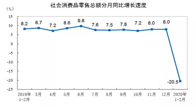 國內自1月份開始受到疫情沖擊,生產消費幾乎冰凍。1-2月份,社會消費品零售總額52130億元,同比名義下降20.5%(扣除價格因素實際下降23.7%,以下除特殊說明外均為名義增長),較去年12月大幅下滑28.5和28.2個百分點,其中僅糧油食品、飲料、藥品等少數維持正增長。(數據來源:國家統計局)
