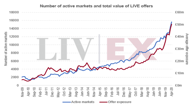 在4月的第一個(gè)星期,隨著更多交易轉(zhuǎn)為在線和,在Liv-ex發(fā)售的優(yōu)質(zhì)葡萄酒總值首次高達(dá)5000萬(wàn)英鎊。