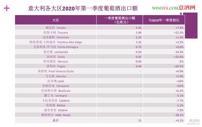 意大利南部各大區葡萄酒的出口額在2020年一季度普遍出現增長。西西里大區(Sicilia)葡萄酒2020年第一季度出口額為0.45億歐元,同比去年增長33.6%;普利亞大區(Puglia)一季度出口額為0.44億歐元,同比去年增長20.5%。