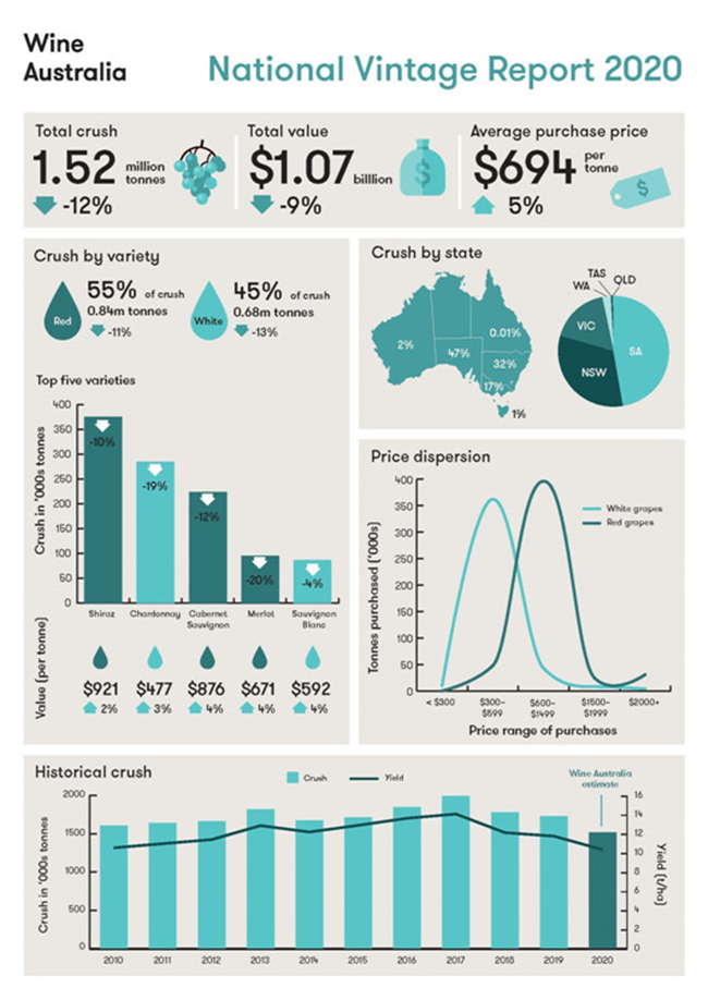 釀酒葡萄的出售總額預(yù)估為10.7億澳元,平均價(jià)格達(dá)到了694澳元/噸,高于2019年的663澳元/噸。