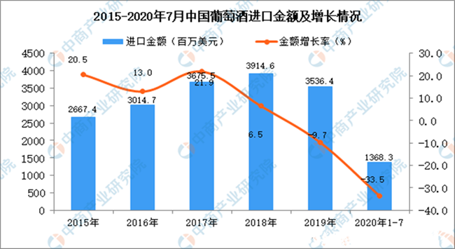 從金額方面來看,2020年1-7月中國葡萄酒進口金額為1368.3百萬美元,同比下降33.5%。