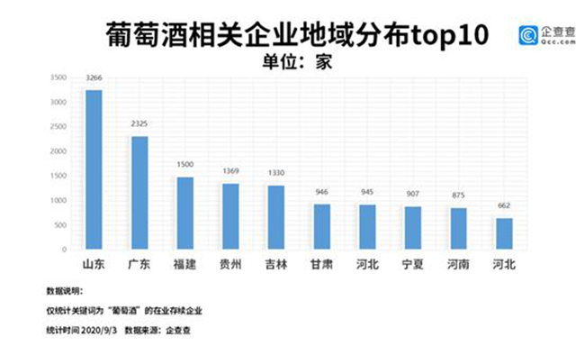 從地域分布來看,我國葡萄酒相關的企業數量較多的地區是山東,共3266家,廣東、福建分別以2325家、1500家分列二三名,貴州、吉林、甘肅等地緊隨其后。
