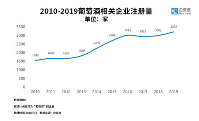從企業發展情況來看,企查查數據顯示,過去十年來,我國葡萄酒相關的企業年注冊量平穩上升。其中2013年至2016年注冊量增長較快,2016年注冊量首次突破3000家,此后幾年數據有所回落。2019年注冊量為3212家,同比增長7.0%。