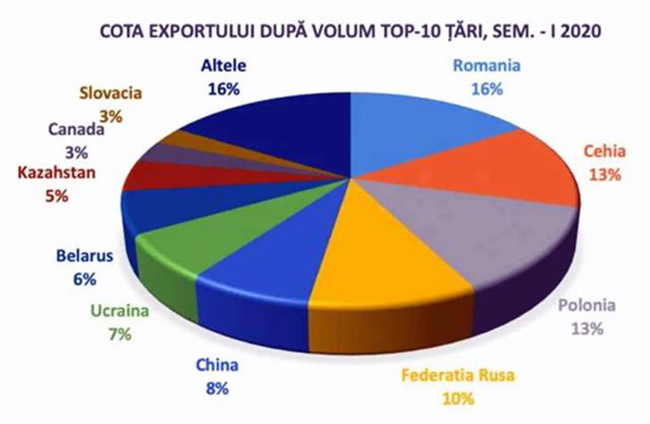 摩爾多瓦向56個國家和地區的出口總額為12.478億列伊, 比2019年前6個月下降了5.7%(即減少了7470萬列伊)。