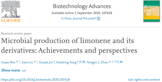 近日,葡萄酒學院楊曉兵副教授團隊在著名生物技術學術期刊《Biotechnology Advances》(IF=10.744)發表了題為 “Microbial production of limonene and its derivatives: Achievements and perspectives” 的綜述文章,系統總結了近年來利用代謝工程和合成生物學策略合成檸檬烯及其衍生物研究進展。西北農林科技大學為第一署名單位,中科院大連化學物理研究所為合作單位;16級本科生任毓瑤和18級博士研究生劉灑灑為共同第一作者,我校楊曉兵副教授與大連化物所周雍進研究員為共同通訊作者,我校靳國杰副教授參與了該綜述的撰寫工作?!禕iotechnology Advances》是生物技術領域頂級國際期刊,在105種應用微生物與生物技術相關的雜志中排名第3,該雜志全年收錄文章在100篇左右,2019年H指數161。