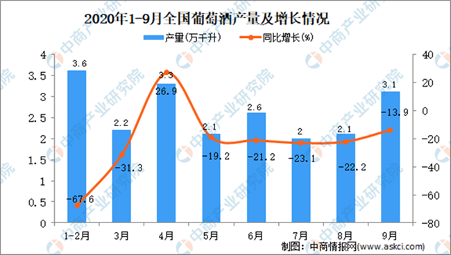 據(jù)中商產(chǎn)業(yè)研究院數(shù)據(jù)庫(kù)顯示,2020年9月全國(guó)葡萄酒產(chǎn)量增長(zhǎng),2020年9月全國(guó)葡萄酒產(chǎn)量為3.1萬(wàn)千升,同比下降13.9%。2020年1-9月全國(guó)葡萄酒產(chǎn)量為20.8萬(wàn)千升,同比下降23.5%。