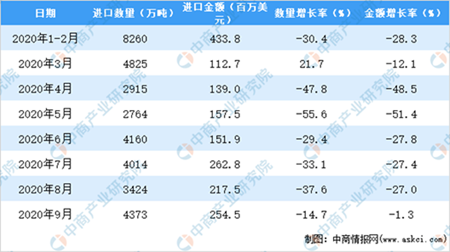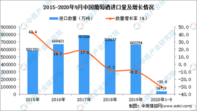 數(shù)2020年1-9月中國葡萄酒進(jìn)口量及金額增長情況