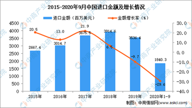 從金額方面來看,2020年1-9月中國葡萄酒進(jìn)口金額為1840.3百萬美元,同比下降29.6%。