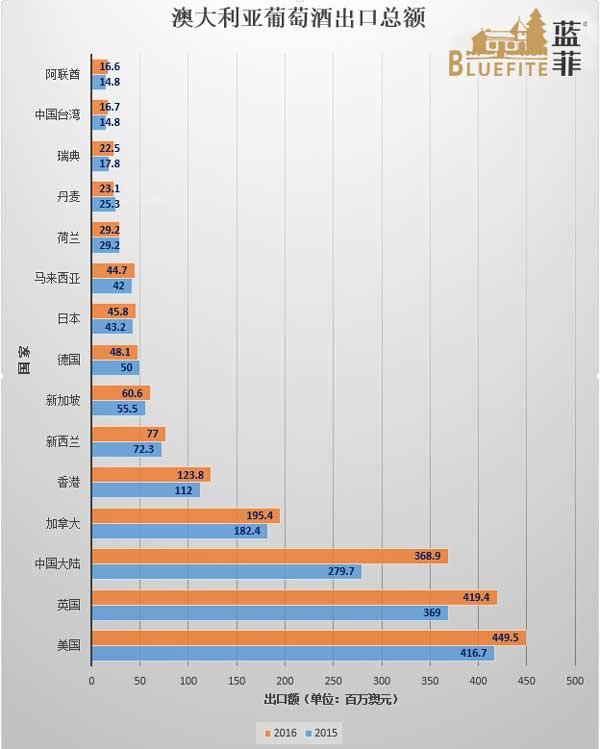 2016年的《澳大利亞葡萄酒出口報(bào)告》顯示,2015年6月至2016年6月,澳大利亞的葡萄酒出口額達(dá)到21.1億美元(約人民幣140億9290萬元),同比增長11%;出口量則達(dá)到7億2,800萬升,同比增長0.5%。