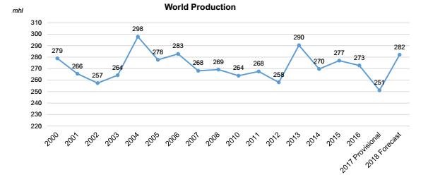 2017年全球葡萄酒產(chǎn)量下降8.2%,為近50年來(lái)最低值,而2018年產(chǎn)量將大幅提升,預(yù)計(jì)為282億升(mhl)。