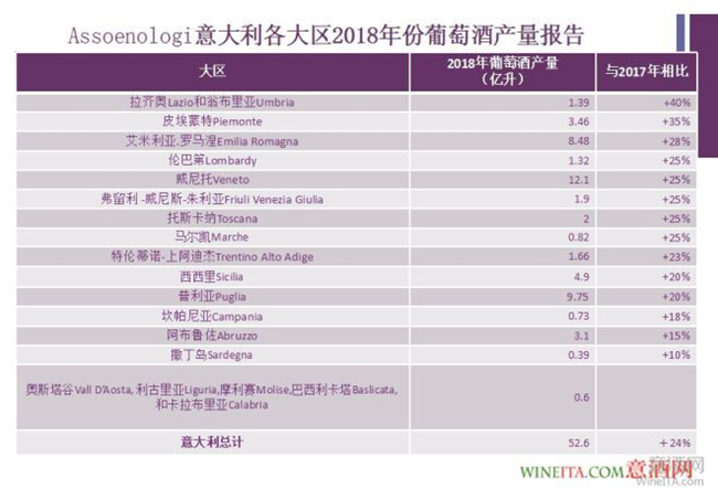 11月中旬,隨著意大利全境葡萄采摘季結束,意大利釀酒師及釀酒技術協(xié)會(Assoenologi)公布了關于2018年份意大利葡萄酒的產量報告?;谝獯罄r業(yè)部的官方數(shù)據(jù),該報告做出結論:2018年,意大利葡萄酒及葡萄汁產量將比2017年份增長24%,將達到52.6億升。今年意大利葡萄酒產量的實際增幅超越了8月末曾發(fā)布的產量預告,整體形勢較為樂觀。