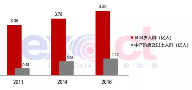 從2011年到2016年間,18-54歲葡萄酒消費人群擴(kuò)大,由3.35億人增長到4.3億人。其中,中產(chǎn)階級以上人群(葡萄酒主力消費人群)不斷上升,從2011年0.48億人上升到2016年1.12億人。