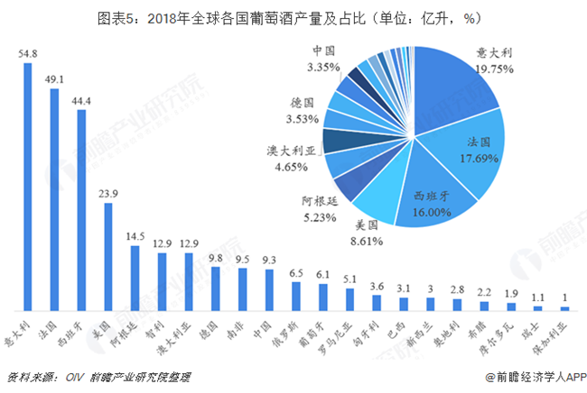 2018年,歐洲依然是全球最大的葡萄酒生產區域,總產量實現181.9億升,占比高達62%。世界排名前三的葡萄酒生產國依次是意大利(54.8億升)、法國(49.1億升)和西班牙(44.4億升),三者的產量總和超過了世界總產量的一半,達到51%。根據OIV的統計口徑,2018年中國葡萄酒產量為9.3億升,排名世界第十,全球占比3.35%。