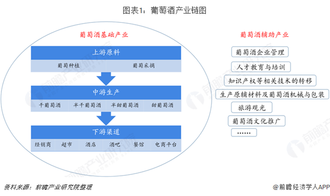 葡萄酒行業所處的產業鏈是由葡萄種植者、葡萄酒生產者、消費者、資源回收者等一系列利益相關者組成,通過自種釀酒葡萄或者收購釀酒葡萄或葡萄原酒,對之進行加工,之后銷售產成品。該系統以產區生態為條件,以葡萄種植為基礎,以葡萄酒生產及其副產物資源利用為保證,涉及到相關的葡萄種植、葡萄酒釀造、葡萄酒包裝、零售賣場、餐飲行業、消費者經濟收入與消費偏好等眾多環節。