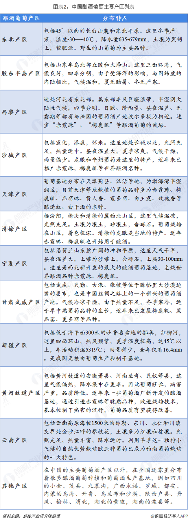 目前國內主要的釀酒葡萄產區分布在華北地區、沿海一帶、新疆、甘肅等地,大面積的種植滿足了中國的葡萄酒產業基本的原料需求。釀酒葡萄一般分為白葡萄和紅葡萄兩種,這兩種葡萄更適合沿海地區的種植。釀酒葡萄一般在九月份成熟,因為對水分要求較大,所以不適合西部地區東北地區種植,可以做鮮食,但不適合存儲。在中國北緯45°-25°廣闊的地域里,分布著各具特色的葡萄、葡萄酒產地。葡萄酒行業經過多年的發展,逐步形成11個具有典型產地特征葡萄酒產區。