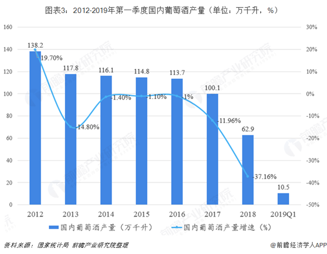 近幾年由于我國實行“三公”政策對葡萄酒行業發展造成一定負面影響,葡萄酒行業一直處于產業結構調整時期。從國家統計局的數據看來,2012年我國葡萄酒產量一直處于下跌狀態,2018年全國葡萄酒產量累計值為62.9萬千升,比2017年總產量的100.1萬千升減少了37.2萬千升,暴跌37.16%。