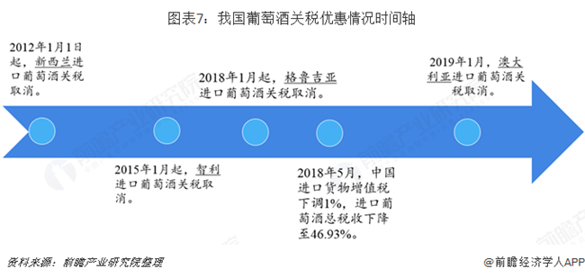 我國分別于2012年和2015年先后對新西蘭和智利進口葡萄酒實施零關稅。2018年起格魯吉亞進口葡萄酒也加入零關稅隊伍。根據中澳自貿協定,2019年1月起,我國進口澳大利亞葡萄酒的關稅降至零。