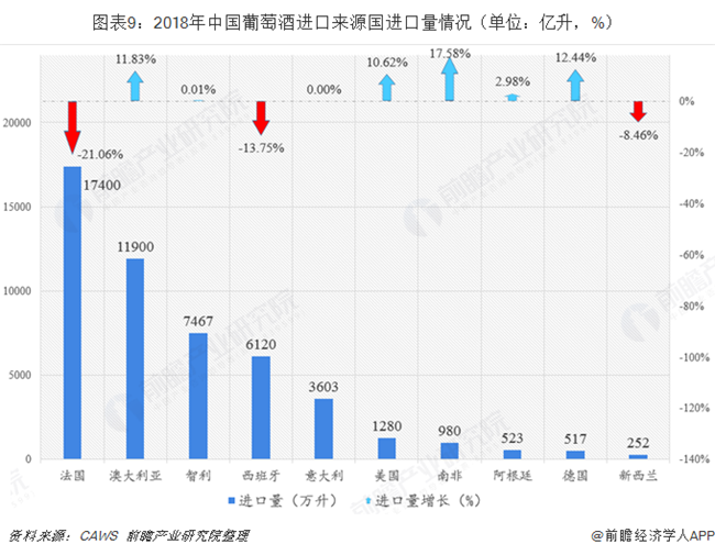 根據中國葡萄酒及烈酒進出口協會(CAWS)發布的2018年中國進口葡萄酒數據報告,2018年法國、澳大利亞和智利為我國葡萄酒三大進口來源國。其中法國葡萄酒進口量達1.74億升,同比下降21.06%;進口金額70.68億人民幣,同比下降3.08%。盡管法國進口量和進口額均較上年有所下降,與第二名澳大利亞的差距逐漸縮小,但其在中國進口葡萄酒市場上的地位依舊排名第一。