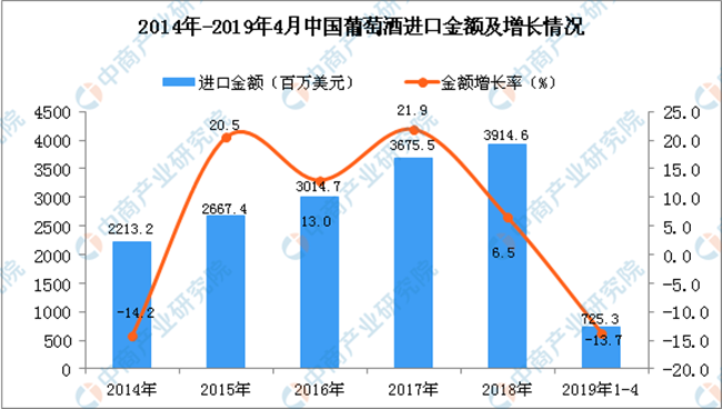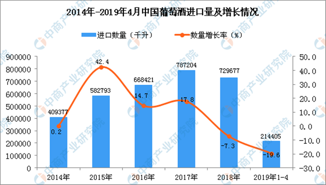 • 2019年1-4月中國葡萄酒進(jìn)口量同比下降19.6%