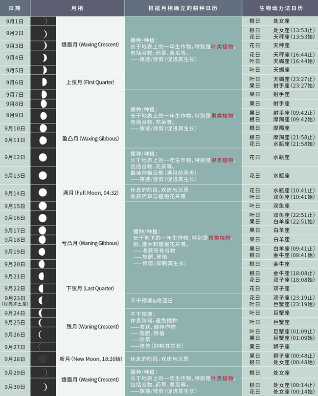雖然這套生物動力歷法在外人看來似乎有些“玄乎”,但也有其理論依據。該體系認為,像海水的潮汐現象一樣,植物中的液體也會隨著月亮對地球引力變化而轉移至不同部位。比如月圓時植物中的液體會向冠部集中,適合種植、嫁接、采收,月缺時液體會向根部集中,更適合除草、翻土、修枝、施肥。