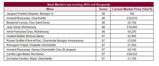 Martin總結:“勃艮第的頂級與其它葡萄酒之間,它們的質量差距遠小于其市場價格差距”。 下表列出了最高得分的2016年份勃艮第葡萄酒及其目前市場價格。