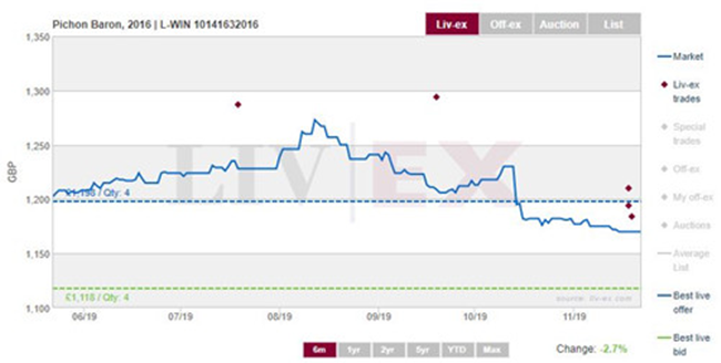 本周雖然情況稍為平靜,但巴頓2016年仍是交易焦點。此酒的最成交價為855英鎊(每箱12×75),比Wine Spectator宣布前的成交價漲了22%。 自此,它一直是最活躍的葡萄酒 -交易總值和數量均是最高。