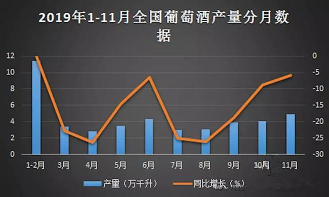 一方面是昂揚(yáng)向上的精神勁頭,另一方面全國葡萄酒產(chǎn)量數(shù)據(jù)卻為其潑了一盆冷水。根據(jù)中國報告大廳對2019年1-11月全國葡萄酒產(chǎn)量進(jìn)行監(jiān)測統(tǒng)計顯示:2019年11月全國葡萄酒產(chǎn)量4.9萬千升,同比下降5.8%,2019年1-11月全國葡萄酒產(chǎn)量為37.2萬千升,累計下降12.1%。