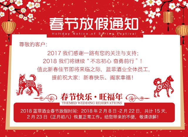 新年的鐘聲即將敲響,根據國家春節(jié)假期通知及藍菲公司的實際情況,確定于2018年2月9日-2月22日,共14天,為藍菲酒業(yè)春節(jié)假期,于2018年2月23日(正月初八)正式上班,請好朋友們悉知。同時在此提前恭祝,新春快樂!