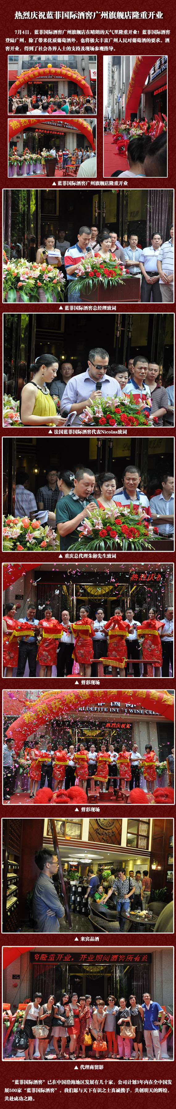 7月4日,藍菲國際酒窖廣州旗艦店在晴朗的天氣里隆重開業(yè)!藍菲國際酒窖登陸廣州,除了帶來優(yōu)質(zhì)葡萄酒外,也將極大豐富廣州人民對葡萄酒的要求。酒窖開業(yè),得到了社會各界人士的支持及現(xiàn)場參觀指導(dǎo)。